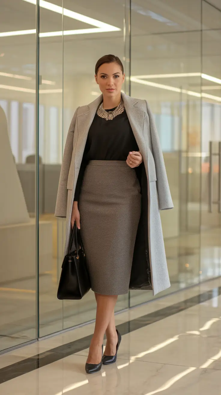 Layering within a monochrome palette allows for creativity through texture and silhouette rather than color. Tailored coats, knit tops, and structured trousers combine to create a balanced, professional look. Accessories remain subtle to maintain harmony, while clean lines reinforce authority. This style appeals to women who prefer understated elegance and timeless fashion. Pinterest audiences are drawn to this look for its calm confidence and effortless polish.