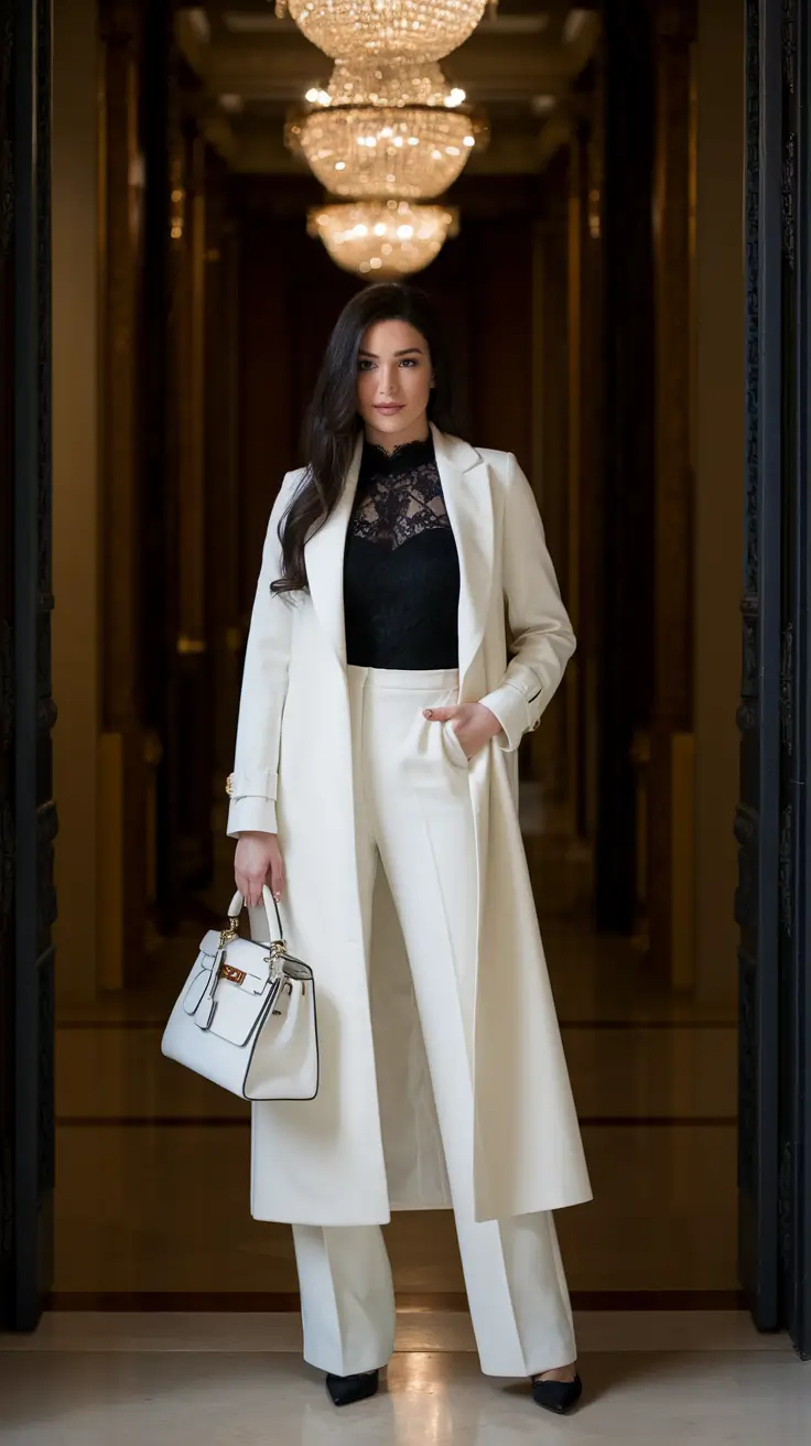 The high end appeal of this outfit comes from its thoughtful balance of structure and softness. A well tailored white blazer and matching trousers or skirt provide a strong foundation, while black lace layered underneath or subtly incorporated adds intrigue. The lace should remain delicate and controlled, ensuring elegance rather than excess. Paired with sleek footwear and minimal accessories, the outfit maintains a polished, executive feel that fits seamlessly into professional environments.