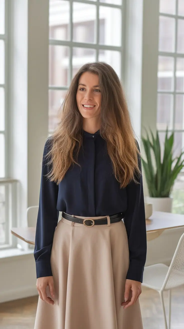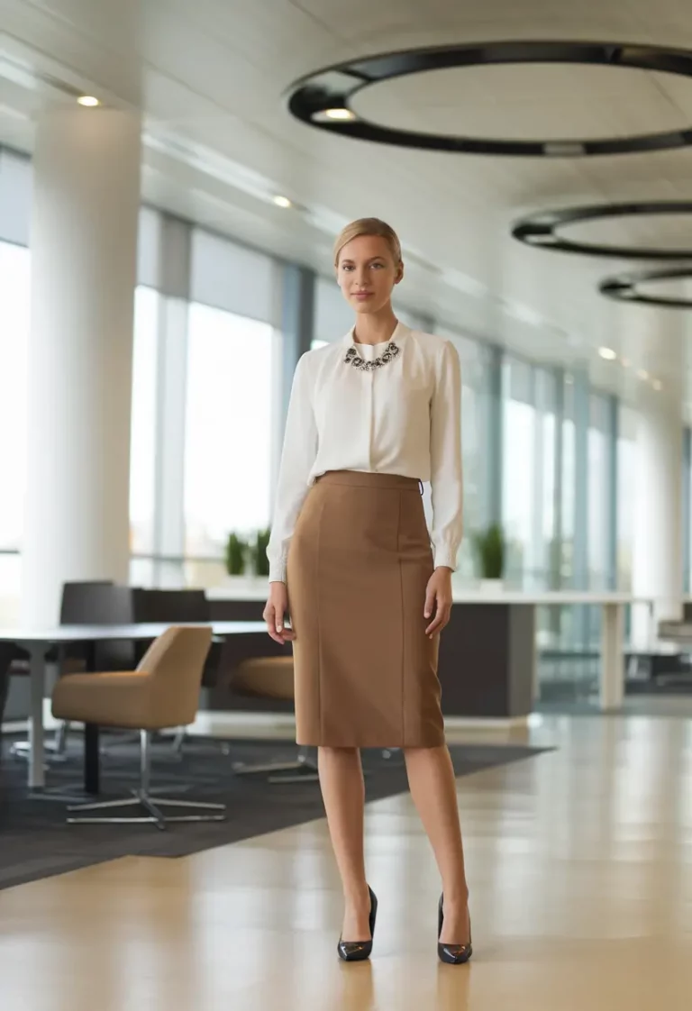 Silk naturally enhances the overall outfit by adding texture and subtle shine, making even neutral tones feel luxurious. When styled under a tailored jacket, it softens the sharp lines and adds warmth suitable for fall workdays. Colors like ivory, champagne, muted bronze, or soft mocha work beautifully against darker suiting shades. This look transitions easily from formal meetings to everyday office tasks, offering comfort without compromising professionalism. It reflects a modern approach to office wear where strength and softness coexist seamlessly.