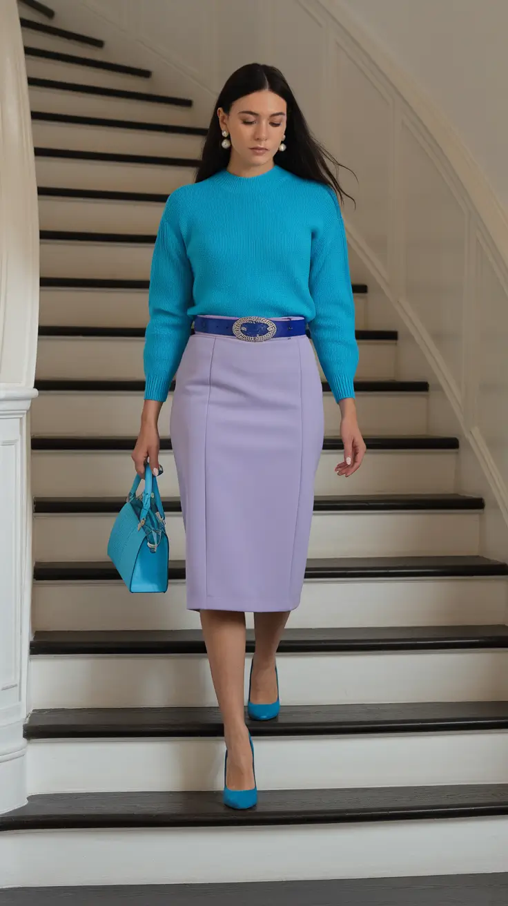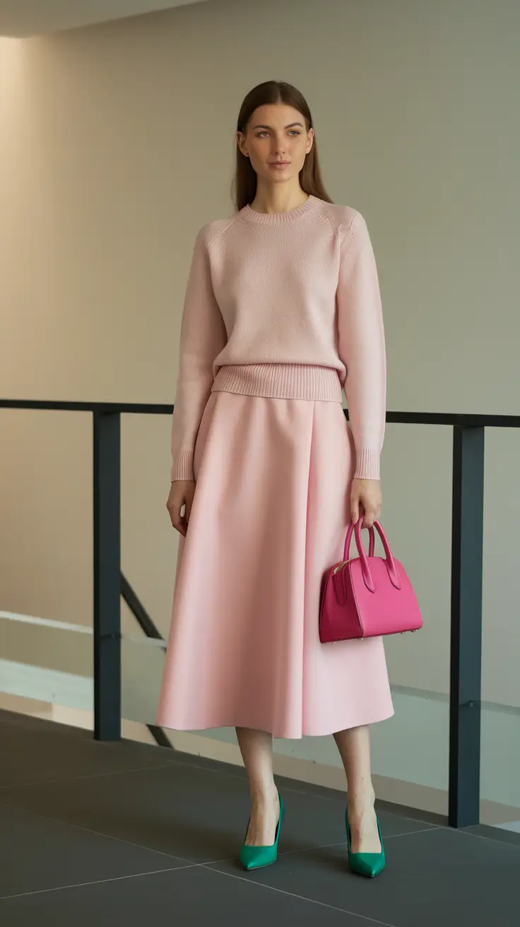 The bold pop element transforms the outfit from simple to striking. A vibrant handbag, statement shoes, or eye catching jewelry introduces contrast without overpowering the softness of the pastel tones. This creates a visually engaging look that feels modern and confident. The key is moderation, allowing the pastel base to remain calm while the bold accent adds personality and flair. This balance makes the outfit suitable for creative offices as well as more traditional work environments.