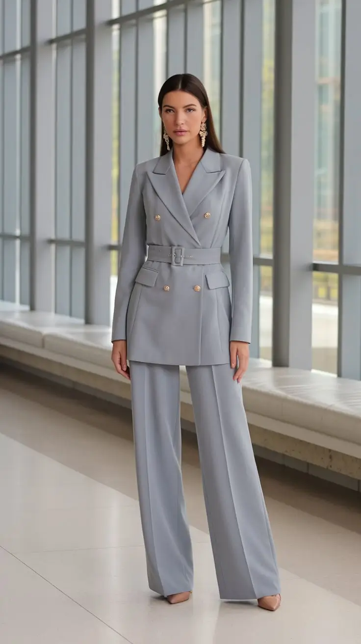 The belted detail not only enhances shape but also introduces versatility. It allows the blazer to be worn as a statement piece over tailored trousers or even styled with a coordinating skirt for variety. The slate shade pairs beautifully with neutral blouses, soft creams, or even muted jewel tones that complement fall’s palette. Comfortable heels or sleek ankle boots complete the look while maintaining professionalism. This outfit is especially practical for busy professionals who need pieces that transition effortlessly from meetings to after work engagements.