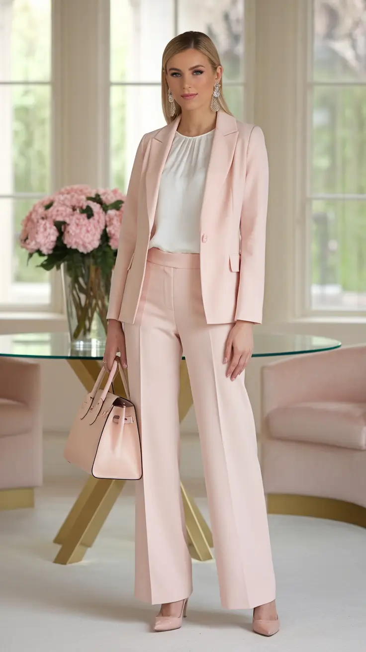 Blush tones bring a refined softness to office wear while still communicating confidence and authority. This outfit idea centers on tailored pieces in muted blush shades that feel calm, polished, and modern for fall 2026. A structured blazer or tailored trousers in blush creates an elegant foundation that stands out subtly in professional environments. The color softens sharp lines, making the outfit feel approachable without losing its power.
