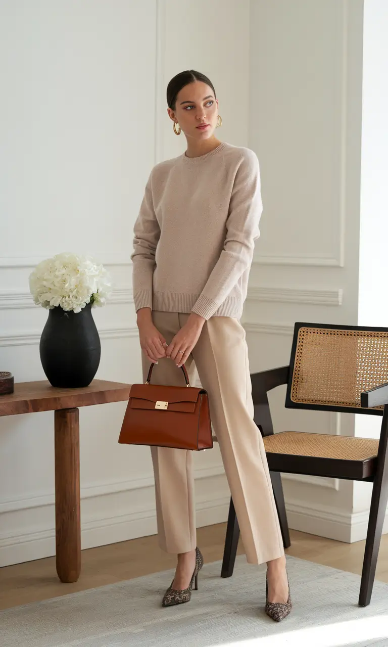 Easy luxury is defined by effortless silhouettes that look polished without appearing overstyled. This outfit embraces fluid movement through fabrics that swing gently with each step, such as wide leg trousers, softly pleated skirts, or relaxed midi dresses styled for the office. The focus is on comfort that feels intentional, creating a look that exudes quiet confidence and understated elegance. For fall 2026, this approach resonates strongly with women who value both style and ease in their workwear.