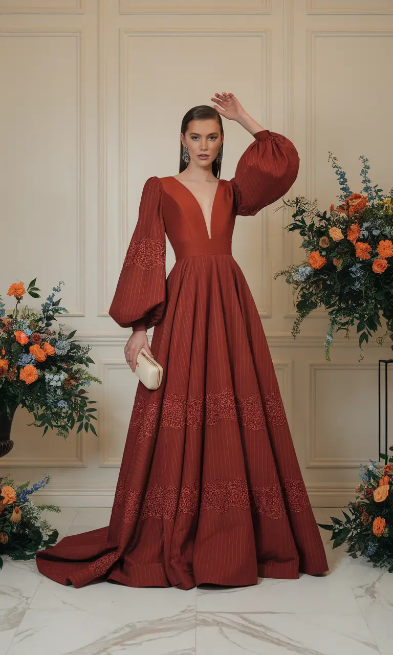To truly embrace the drama of volume, silhouettes become the star of the look. Think puffed sleeves, gathered skirts, or soft cascading ruffles that create a sense of movement and presence. These elements add personality without making the outfit feel overwhelming. When styled thoughtfully, a voluminous rust dress feels regal yet relaxed. Pairing the dress with simple accessories allows the color and shape to remain the focal point. Gold jewelry, delicate heels, and a structured clutch help create a balanced appearance that feels polished while still allowing the outfit to breathe.