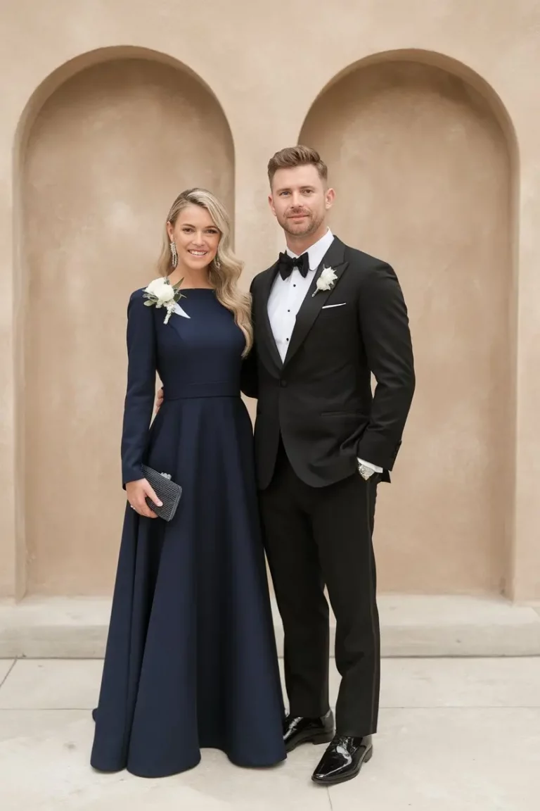 Styling this look requires a focus on balance and intention. Accessories should remain simple yet refined so the structure of the outfit remains the main focus. A pair of elegant heels, delicate silver jewelry, and a sleek clutch can complete the look without overwhelming it. Hair styled in a low bun or soft polished waves enhances the minimal aesthetic while maintaining a graceful finish. The result is a wedding guest outfit that feels calm, confident, and deeply sophisticated. Twisted navy minimalism proves that subtle design details can transform a simple silhouette into something quietly stunning for fall weddings.