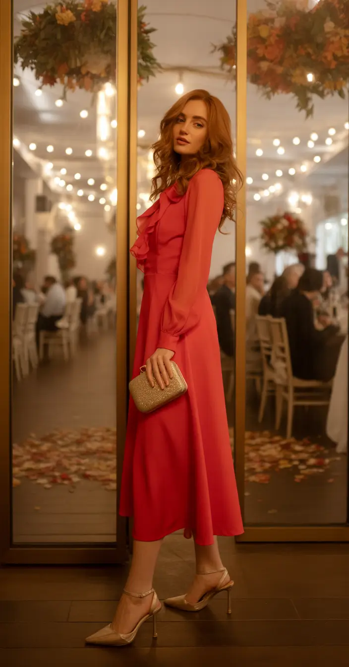Accessories for this look should support the playful elegance of the dress without competing with its texture. Neutral or metallic heels allow the raspberry shade to remain the focal point while adding subtle refinement. Jewelry can remain delicate, perhaps featuring soft gold tones that complement the warmth of the color. Makeup with rosy cheeks and glowing skin enhances the joyful character of the outfit. Hair styled in loose romantic waves or a softly pinned half up style completes the look with effortless charm. Raspberry ruffles create a wedding guest outfit that feels vibrant, romantic, and perfectly suited for candlelit fall receptions.