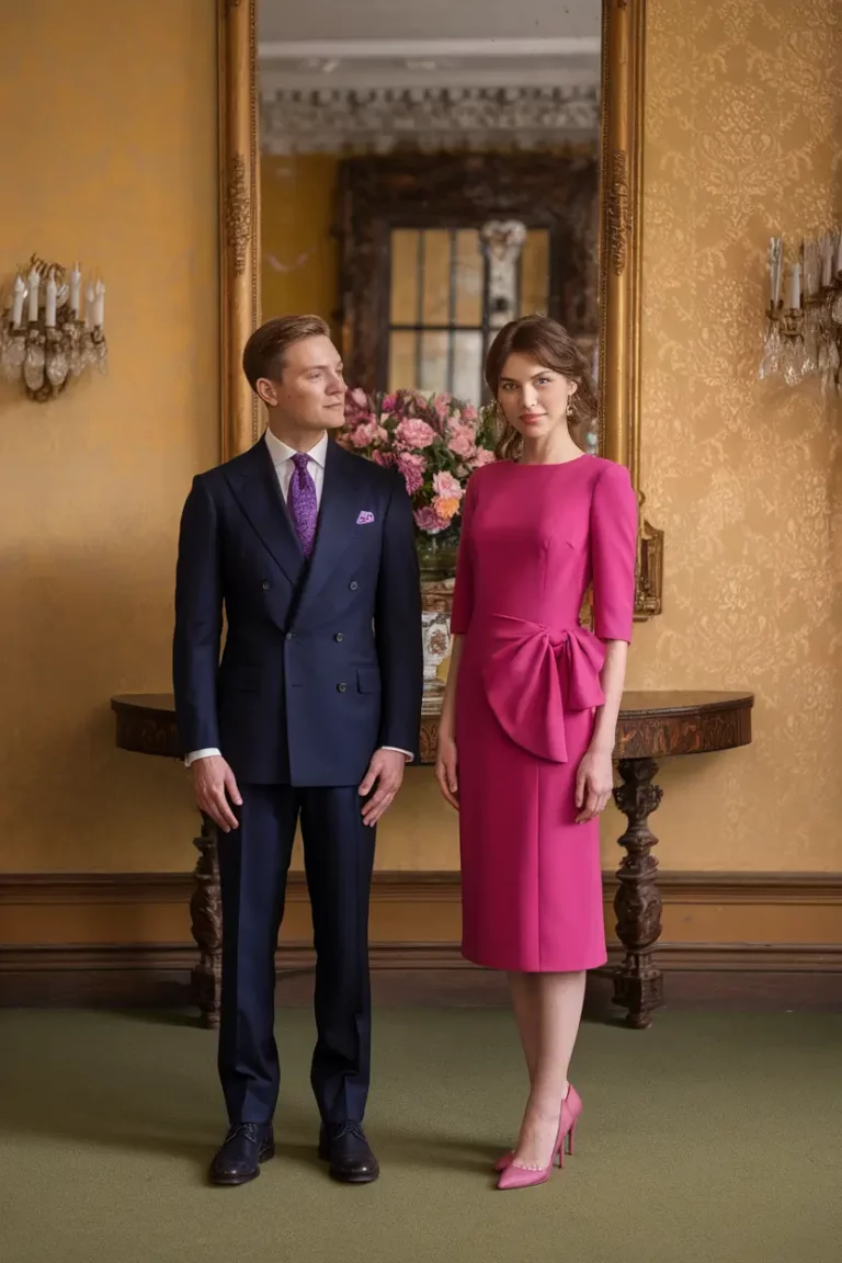 Fuchsia brings a burst of confident energy into wedding guest style while still maintaining an elegant edge. For fall 2026, this shade is being reimagined through tailored silhouettes that combine sharp structure with soft femininity. Instead of flowing gowns, the focus here is on dresses or suits with clean lines, defined waists, and beautifully balanced proportions. The vivid color naturally attracts attention, while the tailored structure keeps the outfit sophisticated and polished. This combination allows wedding guests to embrace bold fashion without feeling overdone.