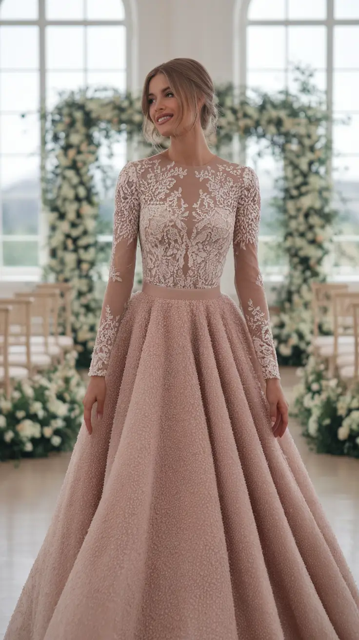 Texture plays an important role in transforming blush into something memorable. Fabrics like jacquard, velvet, and softly structured satin can add dimension to the dress without overwhelming the overall design. Instead of relying on heavy embellishment, the richness of the material becomes the focal point. A blush gown with gentle draping, soft pleats, or delicate gathered fabric allows the light to move across the surface of the dress, creating depth and elegance. This approach keeps the look refined while still feeling visually interesting. In candlelit venues or outdoor evening receptions, the texture of the fabric softly reflects the warm glow of the environment.