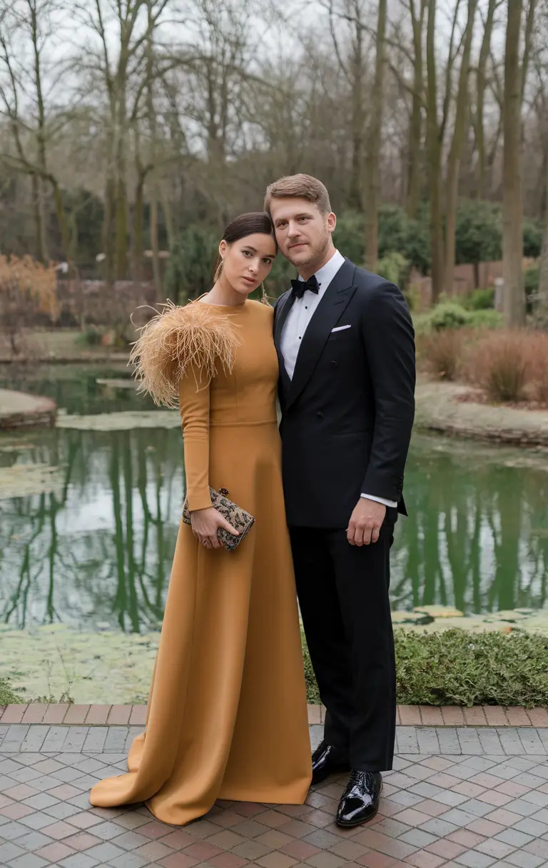 Feather details can be incorporated in many graceful ways that enhance the silhouette of the outfit. A dress with soft feather trim along the sleeves or hemline brings gentle movement that captures attention as the wearer walks or dances. Instead of covering the entire garment, these accents act as artistic highlights that give the look dimension. The mustard tone already carries visual strength, so feathers placed thoughtfully can create balance while maintaining sophistication. Flowing fabrics such as satin or chiffon pair beautifully with feather accents, allowing the dress to move fluidly and reflect the warm tones of the evening light.