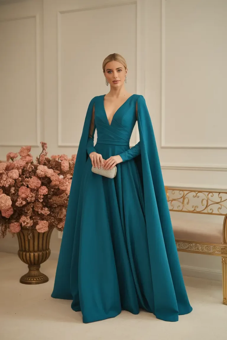 Teal carries a powerful sense of elegance that feels particularly striking during fall wedding celebrations. This rich color combines the depth of blue with the vibrancy of green, creating a shade that feels bold yet refined. When teal is paired with architectural silhouettes, the result becomes a truly captivating wedding guest look. Structured lines, sculpted shapes, and modern tailoring transform a teal dress into something that feels almost like wearable art. This combination brings together confidence and sophistication while still maintaining the grace required for a formal celebration.