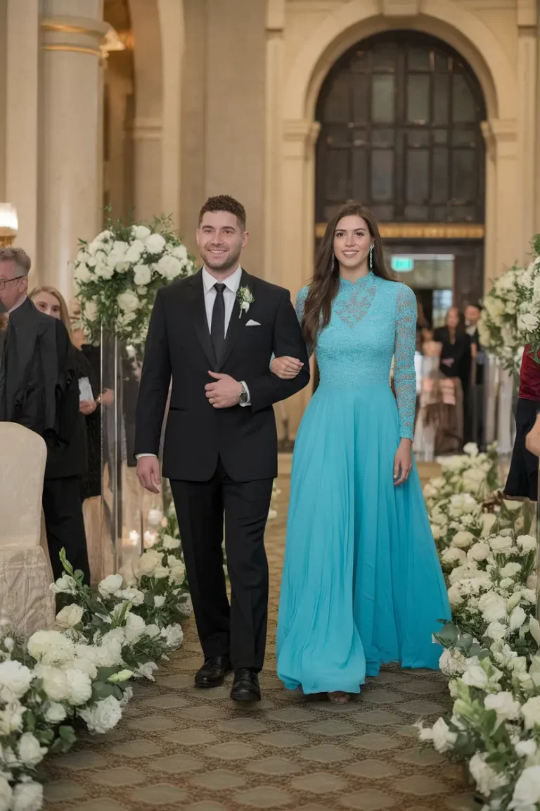 Architectural flair focuses on the shape and structure of the garment. Instead of relying on embellishments or heavy decoration, the design itself becomes the highlight. A teal dress with a sculpted neckline, dramatic sleeves, or a beautifully draped bodice can create visual interest through form alone. These thoughtful design elements allow the outfit to feel bold while still maintaining elegance. Structured fabrics such as crepe or satin hold their shape well and help emphasize the architectural character of the silhouette. When worn with confidence, this style creates a strong yet graceful presence at any wedding venue.