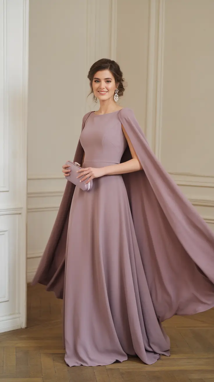Accessories for a dusty mauve outfit should maintain the same refined elegance as the dress itself. Jewelry in soft gold or rose tones complements the warmth of the color while adding subtle luxury. Neutral or metallic heels create a balanced finish without distracting from the graceful palette. Makeup with soft rosy cheeks and luminous skin enhances the romantic quality of the look. Hairstyles such as a loose chignon or flowing waves add timeless beauty and sophistication. Dusty mauve regal fashion offers wedding guests an outfit that feels poised, elegant, and beautifully harmonious with the romantic spirit of fall weddings.