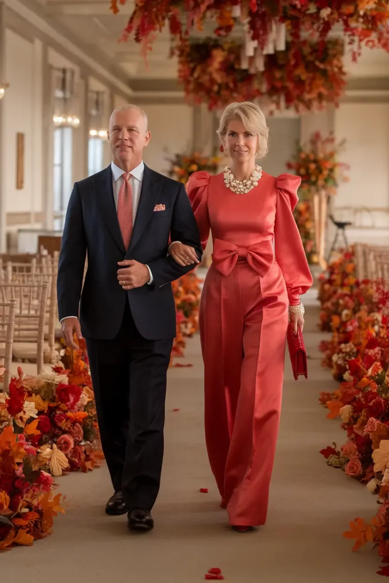 Fall wedding fashion often embraces softness and romance, but there is also something incredibly powerful about outfits that combine grace with confident structure. Formal grace with a touch of strength represents a modern approach to wedding guest style where elegance meets quiet confidence. Instead of delicate fabrics alone, this look incorporates structured tailoring and defined silhouettes that create a strong yet refined appearance. A beautifully tailored dress or suit in deep seasonal tones can deliver a sophisticated presence that feels perfectly suited for formal wedding celebrations.