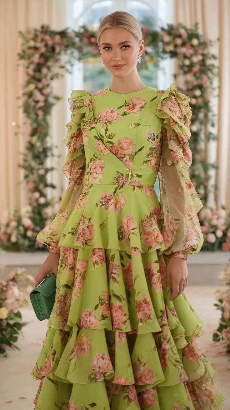 Ruffles introduce softness and movement that enhance the lively energy of floral inspired outfits. Instead of appearing dramatic or overwhelming, carefully placed ruffles can shape the silhouette in a graceful and flattering way. Layers along the skirt or gentle ruffles near the neckline create dimension while maintaining elegance. The fabric moves beautifully as the wearer walks through garden pathways or dances during the reception. Light materials such as chiffon or layered organza allow the ruffles to flow naturally, giving the outfit a romantic quality that feels effortless and celebratory.