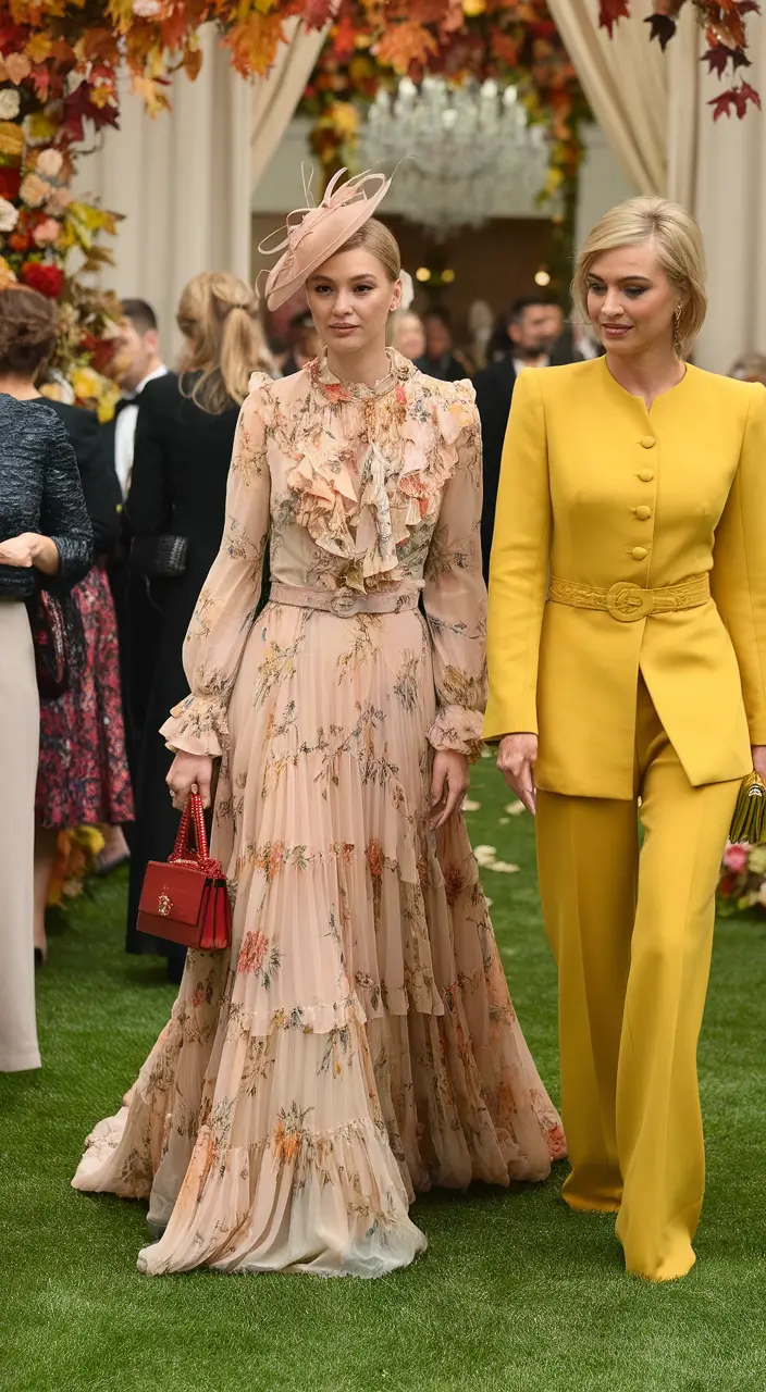 Old fashioned romance carries a timeless beauty that feels especially enchanting in fall wedding settings. Garden drama inspired by vintage elegance combines classic silhouettes with soft floral details and flowing fabrics. This style captures the charm of romantic eras where graceful dresses and delicate craftsmanship created unforgettable fashion moments. A wedding guest outfit inspired by old fashioned romance might feature a flowing skirt, delicate sleeves, and subtle floral textures that feel both nostalgic and elegant. The overall effect is gentle, dreamy, and beautifully suited for garden ceremonies and outdoor receptions.