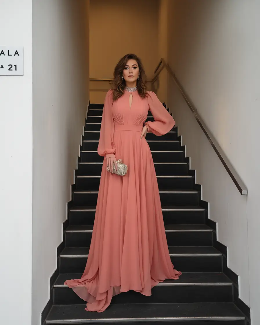 Old Hollywood glamour continues to inspire modern fashion, and when paired with soft coral tones it creates a wedding guest look that feels both vintage and refreshingly modern. Coral carries warmth and brightness that beautifully complements the autumn atmosphere while still feeling romantic and graceful. Instead of deep dramatic shades, soft coral introduces a gentle glow that feels lively yet refined. When shaped into silhouettes inspired by classic Hollywood gowns, this color becomes effortlessly elegant and full of timeless charm.