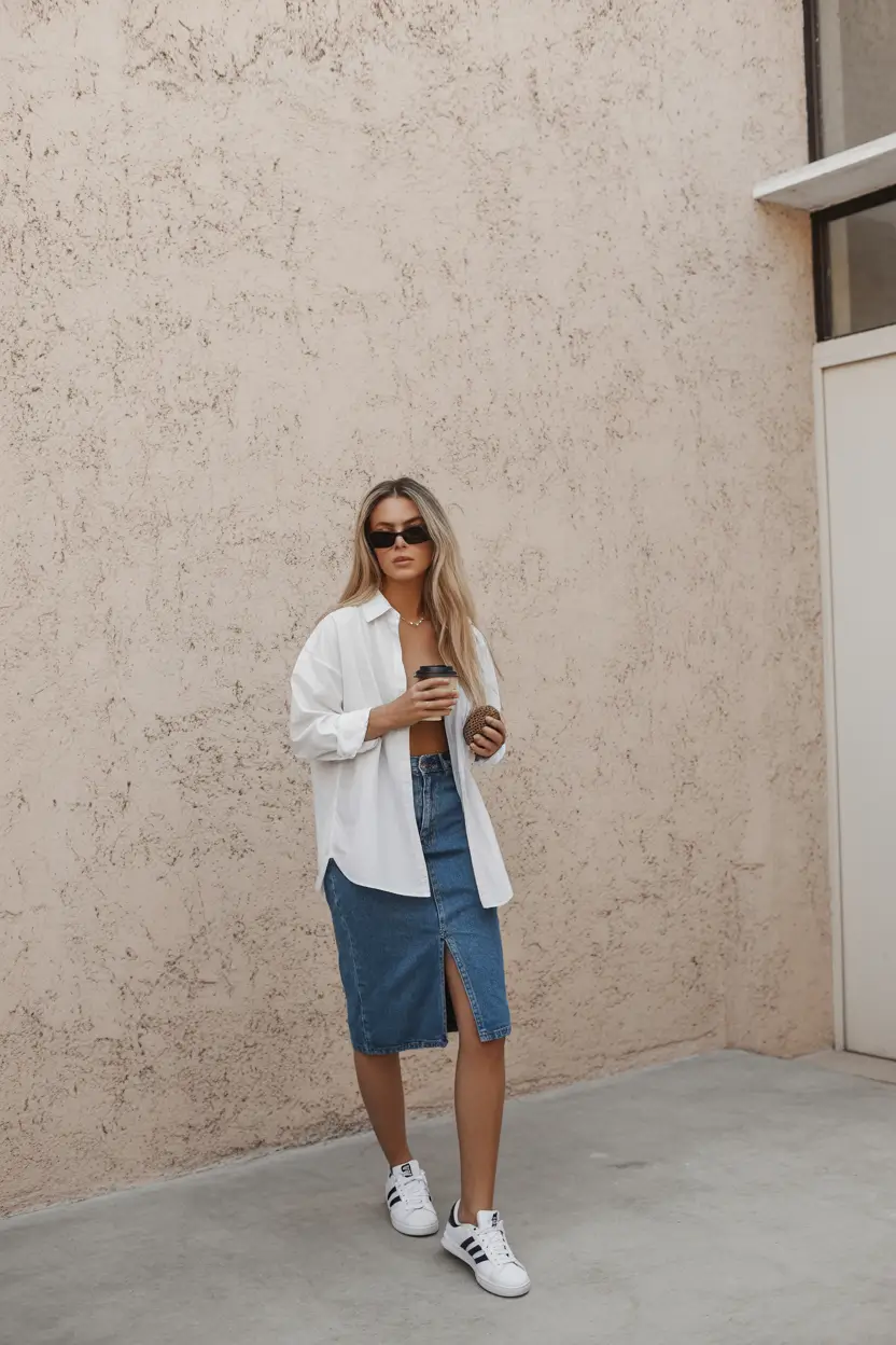 A crisp white shirt paired with a clean cut denim pencil skirt creates a refined spring outfit that blends classic elegance with everyday comfort. The structured shape of the denim pencil skirt brings a polished element to the outfit, while the bright white shirt keeps the overall look fresh and seasonal. White shirts have always been a timeless wardrobe staple, and when styled with denim they gain a relaxed yet sophisticated character that feels perfect for spring days. The simplicity of this combination allows each piece to stand out while still working together to create a balanced and stylish silhouette.