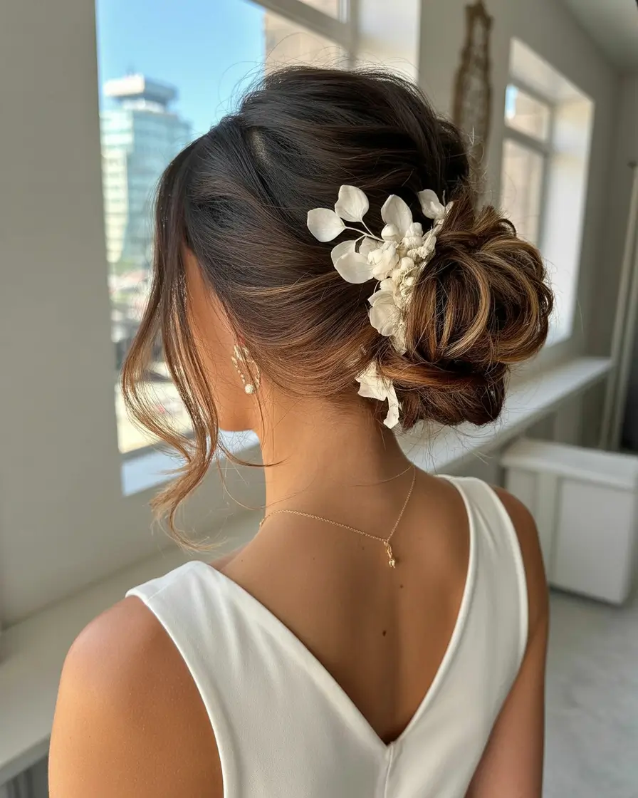 Romantic Low Bun with Soft Floral Detail
