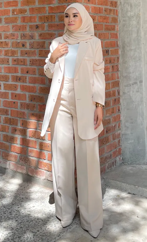 Neutral Longline Blazer with Wide Leg Trousers and Silk Hijab