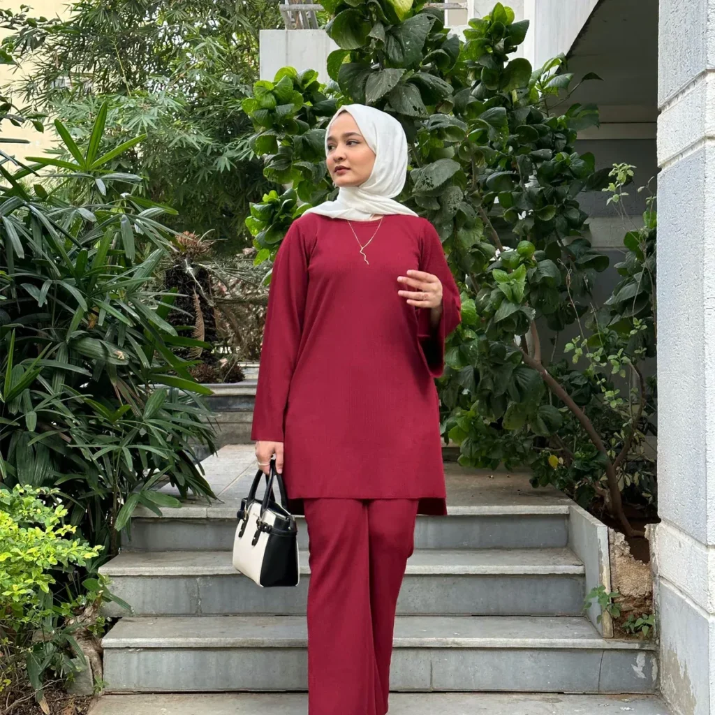 Ribbed knit co-ord sets have gained popularity in modern modest fashion because they combine comfort with coordinated styling that feels effortlessly fashionable. Matching knit tops and maxi skirts or wide-leg knit pants create seamless outfit cohesion while maintaining stretch flexibility and breathable warmth. Ribbed knit textures introduce visual dimension that enhances cozy fall or winter styling without appearing bulky. Neutral tones such as ivory, mocha, or charcoal enhance capsule wardrobe versatility while maintaining timeless elegance. Pairing knit sets with longline coats introduces structured layering that balances soft textures with tailored sophistication.