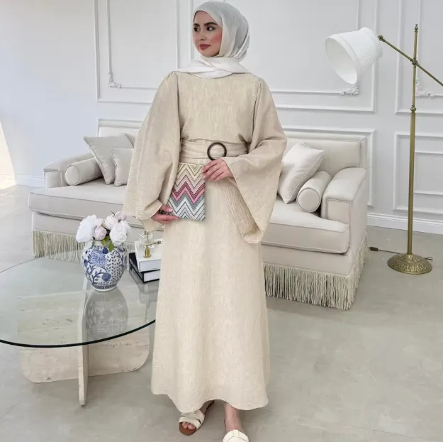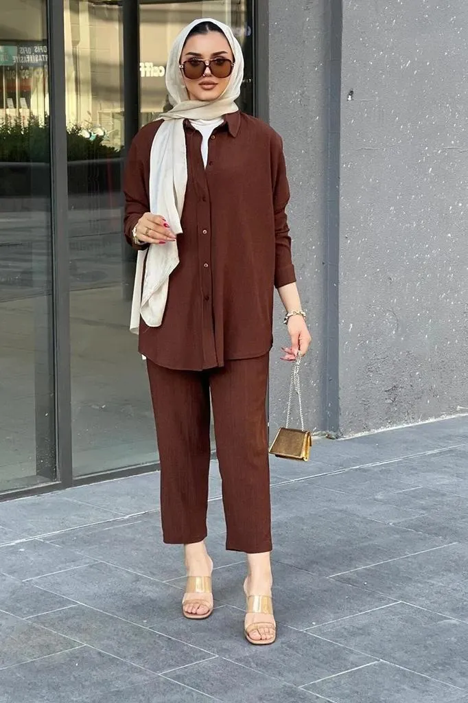 Linen matching sets also allow styling versatility by pairing tops or trousers separately with knit sweaters, blouses, or lightweight jackets for transitional weather layering. Linen fabrics soften naturally over time, enhancing comfort and durability while maintaining stylish appeal. This outfit reflects modern modest fashion’s focus on sustainable comfort, clean silhouettes, and versatile wardrobe staples that support confident, practical, and timeless styling.