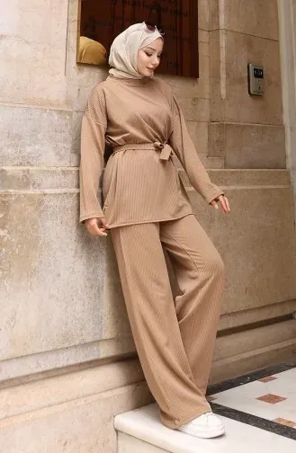 Longline coats allow additional layering flexibility by accommodating thicker knit fabrics during colder weather. Ribbed knit co-ord sets also provide styling versatility by allowing individual pieces to be paired with denim trousers, satin skirts, or tailored pants. This outfit represents how modern modest fashion prioritizes comfort-driven styling while maintaining sophisticated visual coordination. The combination of knit textures and tailored outerwear ensures this outfit remains fashionable, cozy, and adaptable for multiple seasonal occasions.