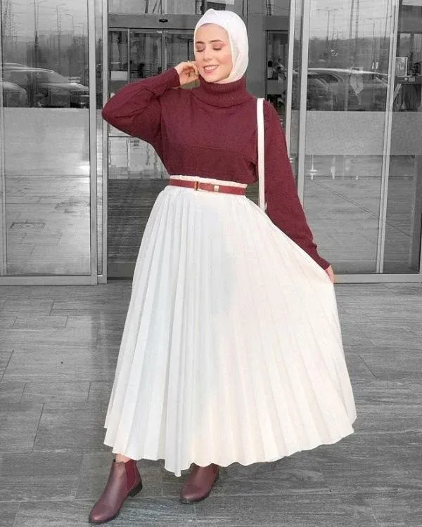 Oversized knit sweaters offer cozy warmth while creating relaxed silhouettes that are highly popular in modern hijab styling. When paired with pleated maxi skirts, oversized sweaters create beautiful contrast between structured volume and soft feminine movement. Pleated skirts introduce graceful flow while maintaining modest coverage that works perfectly for everyday modest fashion. High waisted pleated skirts help define the waistline, preventing oversized knitwear from overwhelming the silhouette. Choosing fall or winter tones such as dusty rose, sage green, or mocha enhances seasonal wardrobe versatility.
