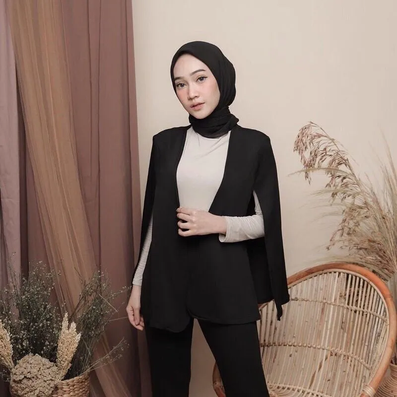 A modal hijab complements this outfit by offering breathable comfort and smooth draping that supports all-day wear. Modal fabrics maintain softness and flexibility while enhancing outfit harmony with tailored silhouettes. Footwear options such as loafers or block heels maintain professional elegance while supporting practical mobility. Accessories like minimalist handbags or statement watches introduce refined detailing while preserving the outfit’s modern simplicity. This outfit demonstrates how layering tailored vest pieces with structured trousers can create stylish modest looks that feel contemporary, polished, and adaptable to multiple daily settings.