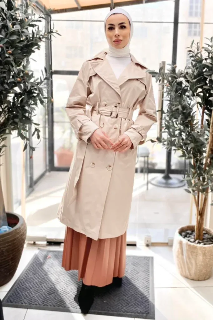 Structured trench coats remain timeless outerwear pieces that perfectly represent modern modest fashion sophistication. A tailored trench coat layered over a fitted top or lightweight sweater creates polished silhouette definition while maintaining practical weather protection. Pairing a trench coat with straight-leg jeans introduces casual balance while preserving overall elegance. Straight-leg denim offers comfortable structure without feeling restrictive, making it suitable for long daily activities. Choosing denim in darker washes such as deep blue or charcoal enhances outfit versatility while maintaining refined styling.