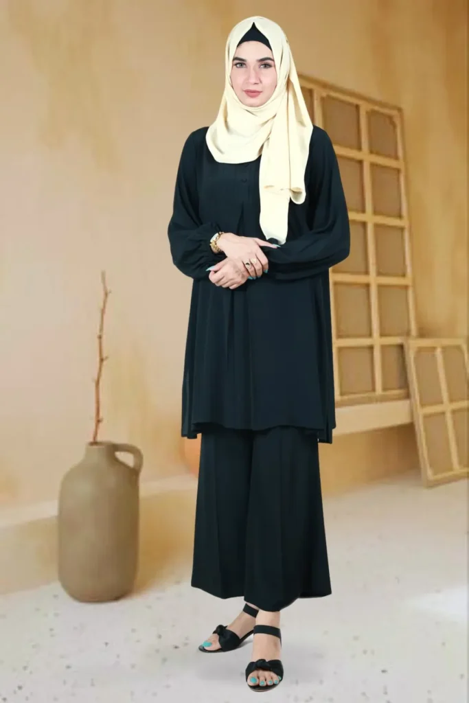 A jersey hijab perfectly complements this coordinated outfit by offering comfortable stretch and easy styling that supports all-day wear. Jersey fabrics provide secure draping without requiring constant adjustment, making them practical for busy lifestyles. Footwear choices such as heeled ankle boots or classic loafers elevate the outfit while maintaining functional comfort. Accessories like structured tote bags or minimalist jewelry enhance visual sophistication while preserving the outfit’s coordinated aesthetic. This outfit demonstrates how matching sets can simplify modest styling while delivering refined and modern elegance suitable for casual work environments or relaxed social gatherings.