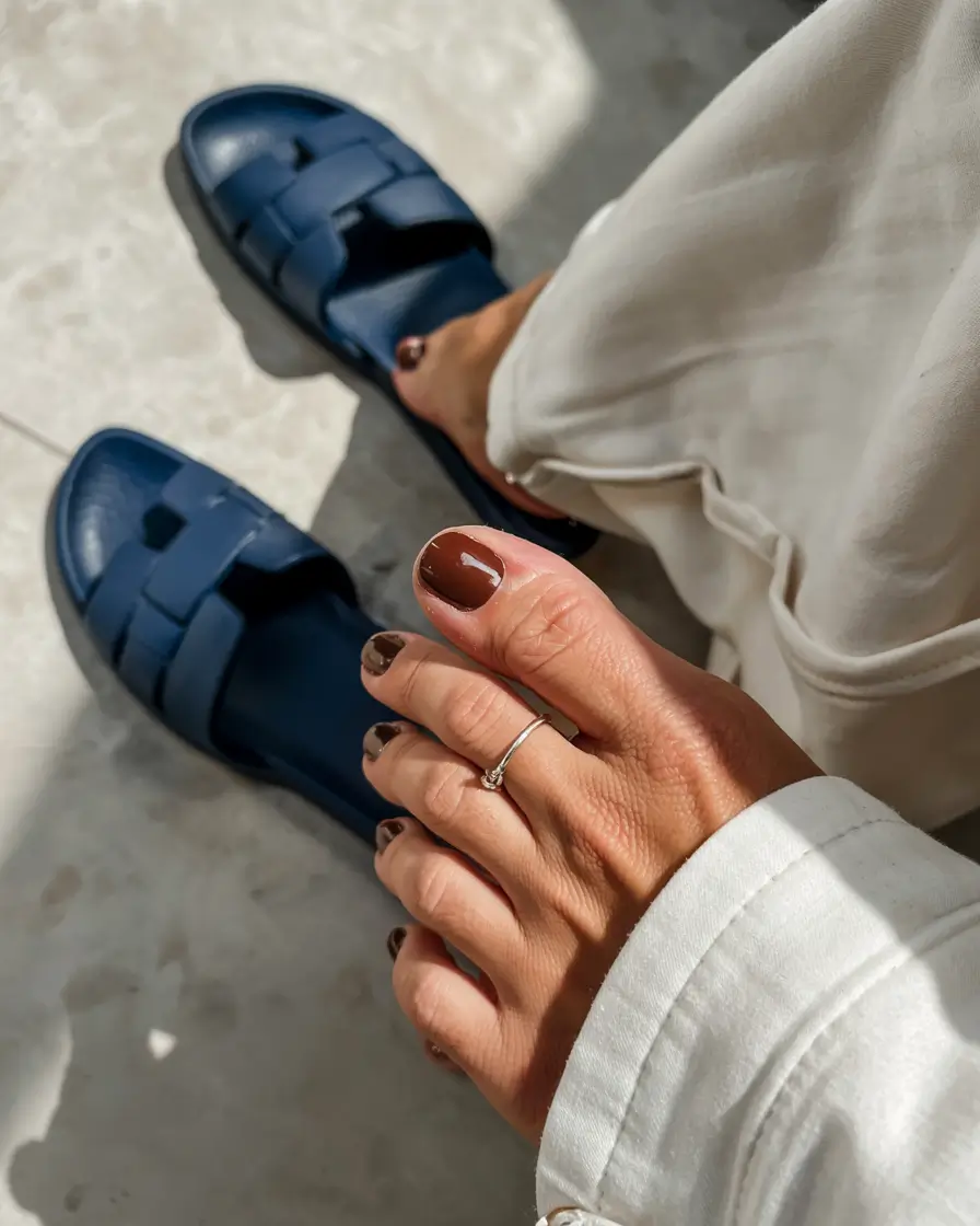 To perfect chocolate brown minimalism, choose a creamy, deep brown with warm undertones rather than a cool espresso shade. The warmth keeps it spring-appropriate rather than fall-inspired. Keep the nails evenly shaped and well-polished to maintain that sleek minimal look. If you want a slight detail, consider a tiny gold dot or thin line on the big toe for subtle enhancement. However, even completely plain, this color makes a statement. A high-gloss top coat enhances richness and dimension, while matte can give it a fashion-forward editorial vibe. Pairing this pedicure with monochrome outfits elevates the entire look. It’s ideal for women who appreciate clean aesthetics and timeless tones. Chocolate brown may feel unexpected for spring, but that uniqueness makes it even more stylish. It shows confidence and refined taste.