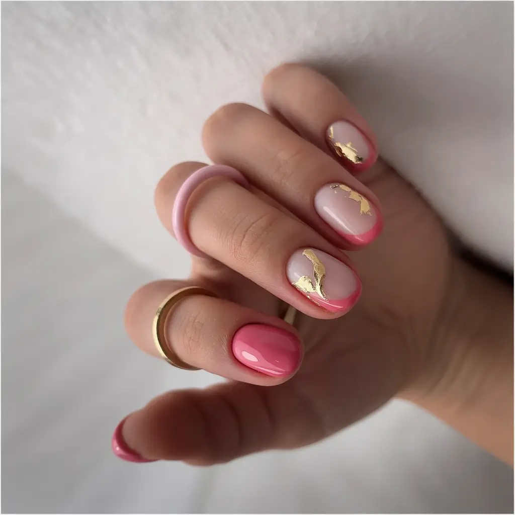 This manicure style has become very popular on Pinterest because it blends bold color with delicate elegance. Raspberry adds vibrancy and personality while lavender softens the design with gentle pastel charm. The golden foil accents add sparkle and texture that make the manicure look sophisticated in close up photographs. The combination feels playful yet refined, making it ideal for seasonal beauty inspiration boards that celebrate colorful nail trends.