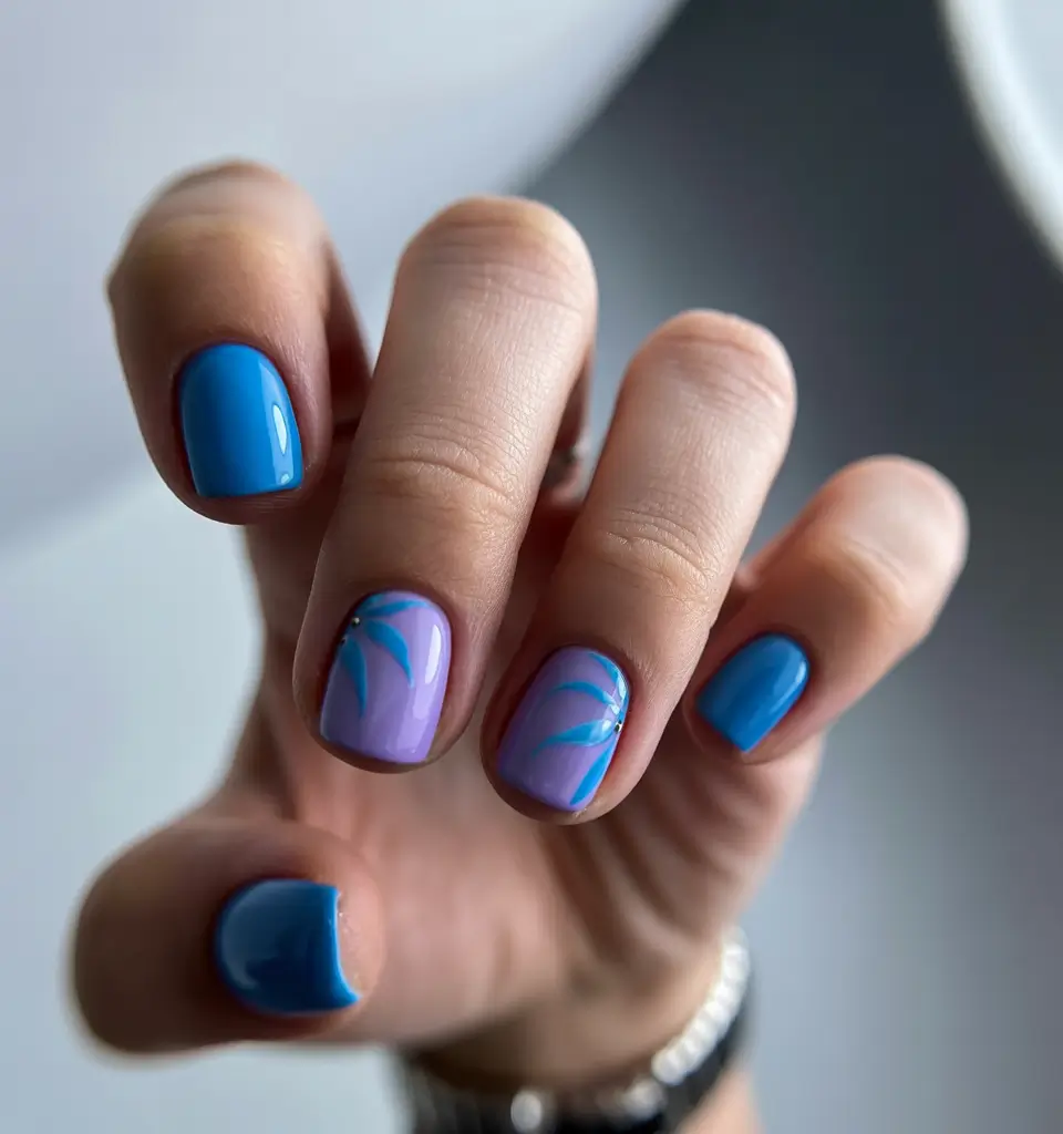 Nail artists usually paint thin leafy branches or small botanical patterns across a few accent nails using white or soft green tones. These plant designs are often created with fine brush strokes that mimic the natural shape of leaves and stems. The artwork appears graceful and subtle, allowing the blue background to remain the main focus while the botanical accents provide texture and detail. This combination creates a balanced manicure that feels elegant, calm, and inspired by the natural world.