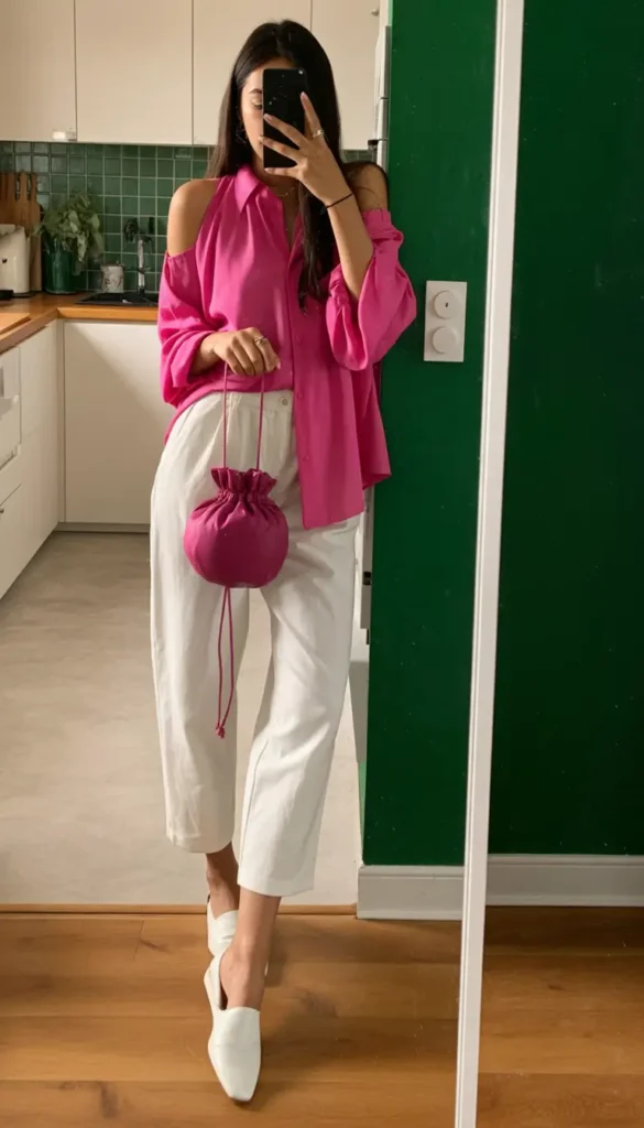 The combination of bold hot pink and calming soft neutrals creates a perfect balance between statement fashion and everyday comfort. A shoulder cutout sweater or top instantly adds personality while keeping the outfit breathable for unpredictable spring weather. The exposed shoulder detail gives the outfit a light, airy feel that works perfectly during cool mornings and slightly warmer afternoons. Pairing this vibrant top with beige wide-leg trousers or soft cream joggers keeps the overall look grounded and wearable. The contrast between the strong pink shade and the calm neutral base allows the outfit to stay eye-catching without feeling overwhelming or overly styled.
