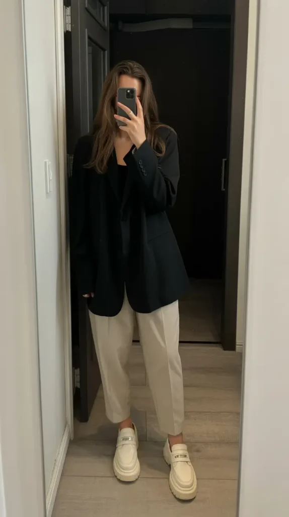 This outfit works beautifully for casual work environments, city outings, or brunch gatherings where comfort meets refined styling. The oversized blazer provides adjustable warmth while maintaining a strong fashion statement. The soft neutral palette photographs elegantly, making this outfit a highly shareable Pinterest inspiration for Spring 2026 casual tailoring trends.