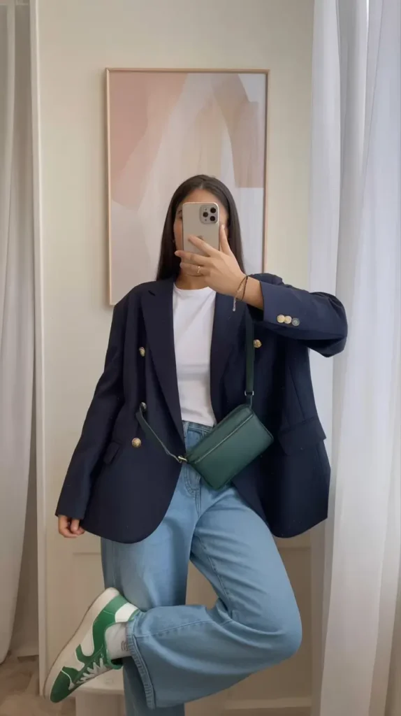 This outfit works beautifully for transitional spring weather when mornings feel cool but afternoons warm up quickly. The blazer provides adjustable layering that can easily be removed, while the sporty green base keeps the outfit fresh and youthful. It is ideal for casual office days, college campuses, weekend errands, or city coffee walks. The strong contrast between navy tailoring and relaxed sporty accents photographs well, creating visually balanced Pinterest outfit inspiration that feels both elevated and wearable for Spring 2026 styling.