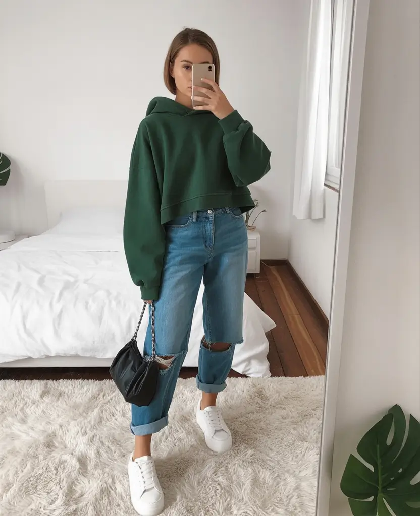 A forest green hoodie paired with relaxed denim creates a naturally balanced spring outfit inspired by earthy seasonal tones and comfortable everyday styling. The rich forest green shade reflects nature’s early spring color palette, offering a refreshing alternative to traditional neutral hoodies. Choosing an oversized or relaxed-fit hoodie enhances the cozy silhouette while allowing breathable layering. Pairing the hoodie with light or medium wash relaxed denim jeans introduces contrast while maintaining casual comfort. Straight-leg or vintage-inspired loose denim helps create movement and prevents the outfit from appearing overly structured or restrictive.