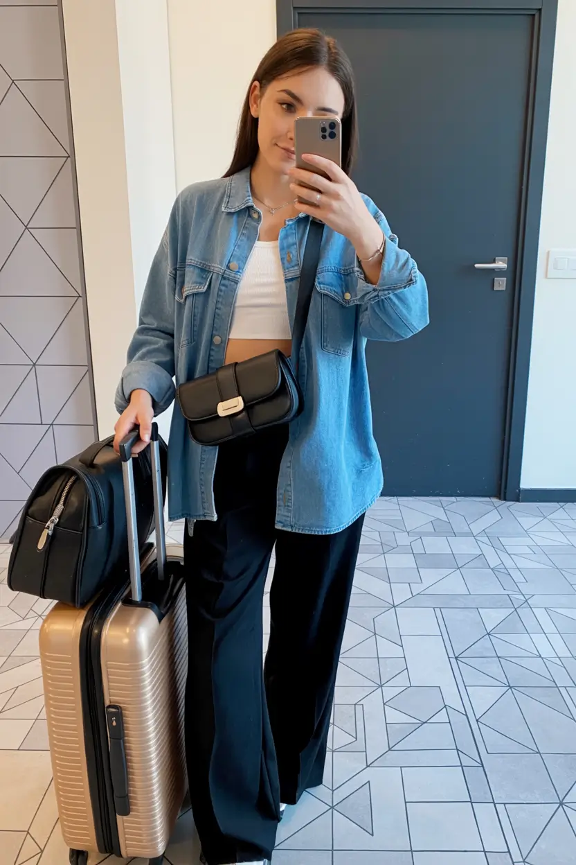 Pinterest users frequently save denim airport outfits because they combine everyday comfort with effortless fashion. Denim pieces can easily be worn again once the traveler arrives at their destination, making them a practical packing choice. A denim jacket worn during a flight can later be styled with dresses, skirts, or casual trousers for sightseeing. This adaptability makes denim layers an essential part of modern travel wardrobes. Airport ready denim outfits create a smooth transition between travel comfort and stylish exploration once the adventure begins.