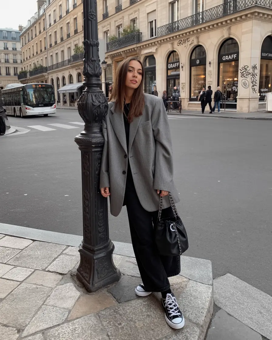 Layering oversized grey pieces helps create a balanced outfit that feels both cozy and fashionable. A soft oversized sweater paired with slim jeans or relaxed trousers creates a comfortable silhouette that feels modern yet timeless. Many travelers add lightweight scarves or crossbody bags to complete the look while keeping essentials close during their walks. Grey also pairs beautifully with white sneakers or neutral boots, creating a travel outfit that feels simple but thoughtfully styled.