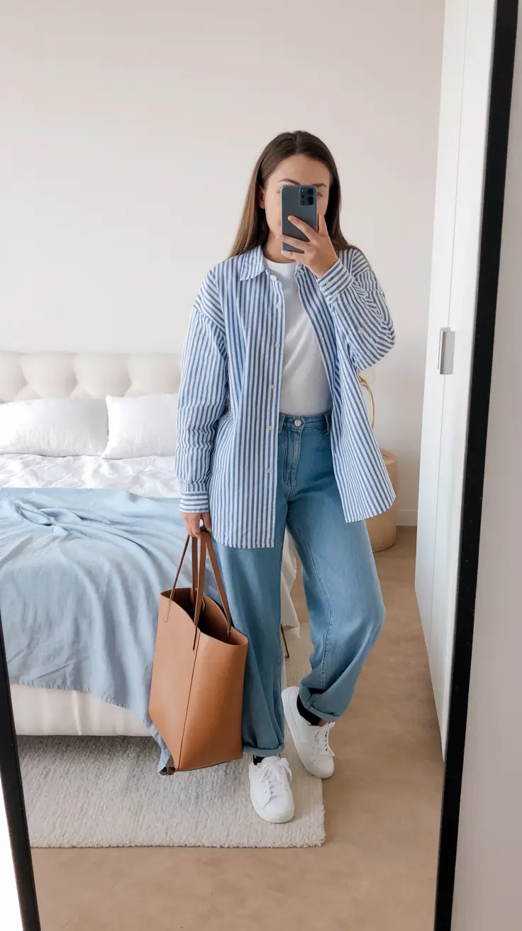 The beauty of striped travel outfits lies in their simplicity and versatility. A soft cotton striped shirt can be worn tucked into high waisted jeans for a polished look or left slightly loose for a relaxed travel aesthetic. Many travelers layer the shirt under a light cardigan or soft jacket during cooler spring mornings. This layering approach keeps the outfit comfortable while allowing it to adapt to changing weather throughout the day. Comfortable white sneakers or classic loafers usually complete the look, making it easy to move through busy travel days while maintaining a stylish appearance.