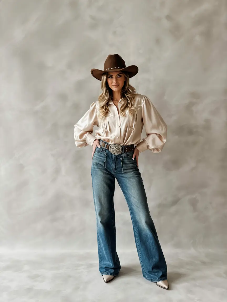 Pinterest audiences appreciate silky western outfits because the flowing fabric captures motion beautifully in photos, creating soft elegant visuals that feel polished yet effortless. This style works wonderfully for sunset rodeo events, country date nights, outdoor gatherings, and styled photoshoots where graceful fashion stands out. Styling details like gentle front tucks or slightly flared denim can personalize the outfit while keeping the overall silhouette clean and flattering. Hairstyles such as soft curls, sleek low buns, loose straight layers, or braided ponytails enhance the refined feminine mood. Makeup pairs best with luminous skin finishes, warm blush tones, subtle shimmer eyeshadow, and natural lip colors that complement the soft palette. Accessories like minimalist gold jewelry, suede clutches, or compact leather handbags add tasteful sophistication while maintaining western harmony. This ensemble expresses confident femininity through fluid fabrics and structured layers, making it ideal for women who love combining gentle elegance with timeless cowgirl strength.