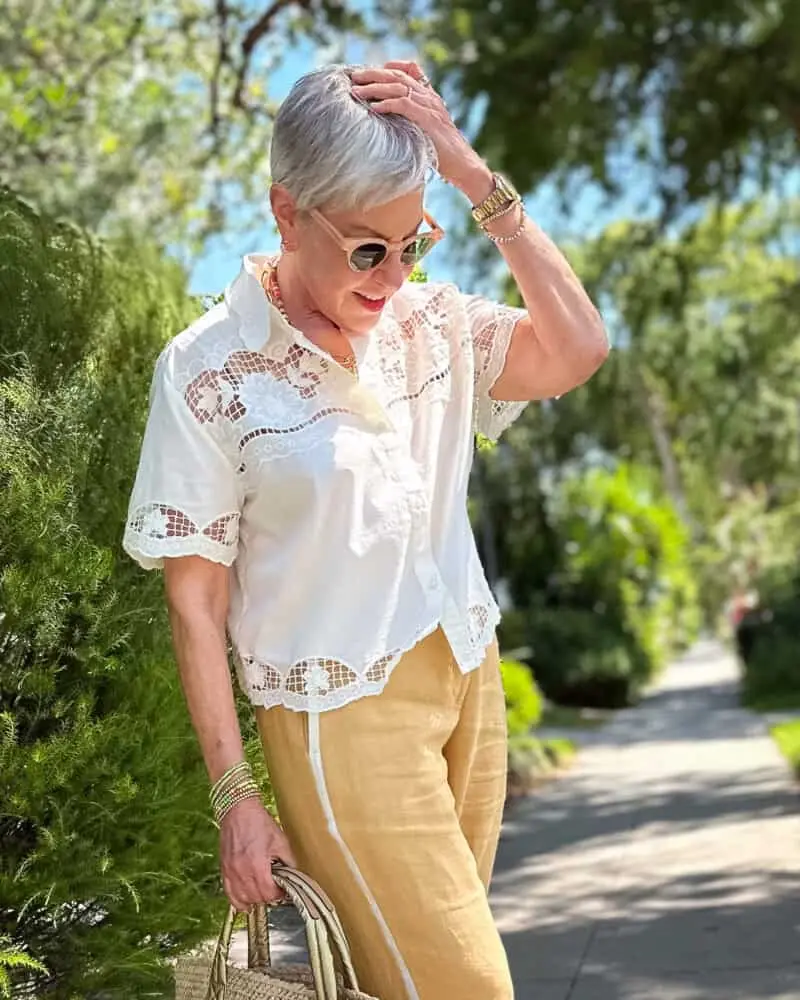 Relaxed fit linen blend pants complement eyelet blouses by introducing structured comfort that enhances outfit harmony while maintaining breathable wearability. Linen-cotton blend fabrics offer soft texture and airflow while creating crisp tailored silhouettes that feel polished yet relaxed. Neutral linen pant tones such as warm beige, muted sage, or soft gray remain popular Pinterest choices because they balance intricate blouse detailing while extending wardrobe versatility. Cushioned espadrille flats or supportive leather sandals complete the outfit, while structured straw handbags and delicate bracelets enhance refined cozy styling.