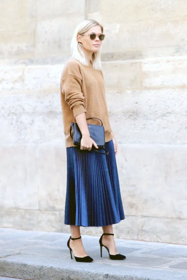 Pleated midi skirts pair seamlessly with relaxed button-down shirts by introducing graceful movement and feminine texture that enhances cozy spring styling. Lightweight chiffon or satin pleated skirts create elegant flow while maintaining breathable comfort suitable for seasonal weather changes. Soft neutral or pastel skirt tones complement structured shirts while preserving refined wardrobe balance. Low block heels or cushioned slingback flats complete the outfit by providing stable comfortable elevation, while structured handbags and delicate layered necklaces enhance sophisticated yet approachable spring styling.