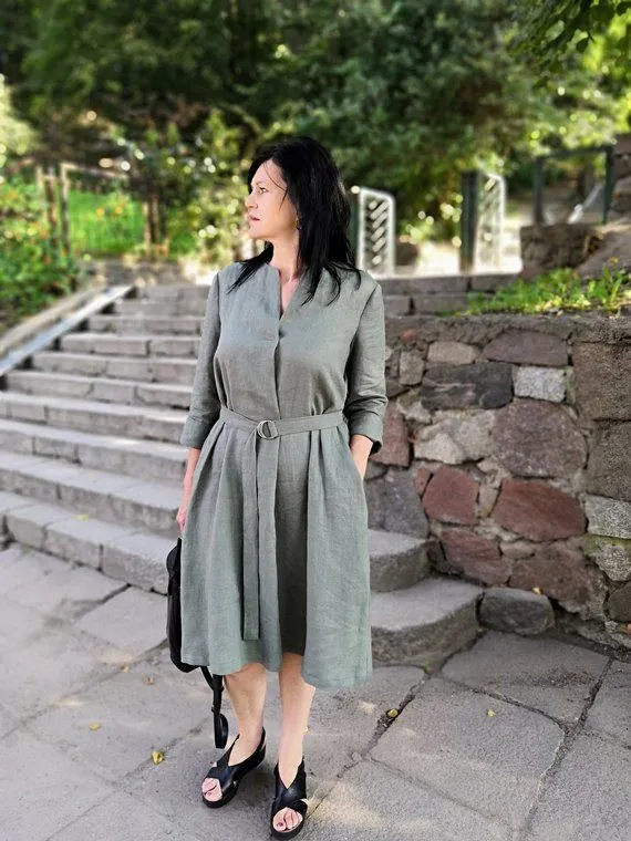 Linen Button Front Dress with Soft Belted Waist Styling