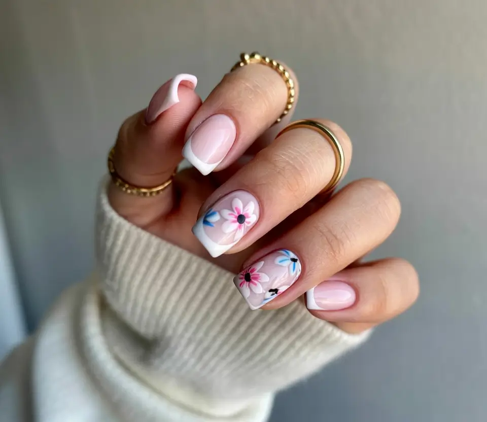 This manicure is also highly adaptable to various nail shapes and lengths. Almond and oval nails accentuate the elegance and detail of the flowers, while shorter or square nails maintain a minimalist, refined appearance. Soft pink French nails with delicate spring flowers combine tradition, subtle creativity, and seasonal charm, making them a timeless choice for Easter and spring-inspired manicures.