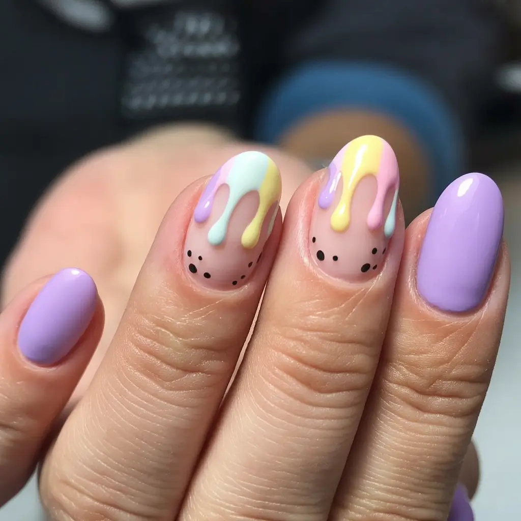 Pastel drip nails take inspiration from the sweetness of Easter treats, offering a fun and modern twist on traditional spring nail designs. A neutral or soft base color is accented with pastel “drips” in shades like lavender, pink, yellow, and mint, creating a playful, candy-like effect. The drips appear to flow naturally down the nails, mimicking the look of colorful icing or glaze, and instantly evoke a festive, whimsical vibe. This manicure is perfect for Pinterest fans who love creative, eye-catching Easter nail ideas that feel both playful and polished.