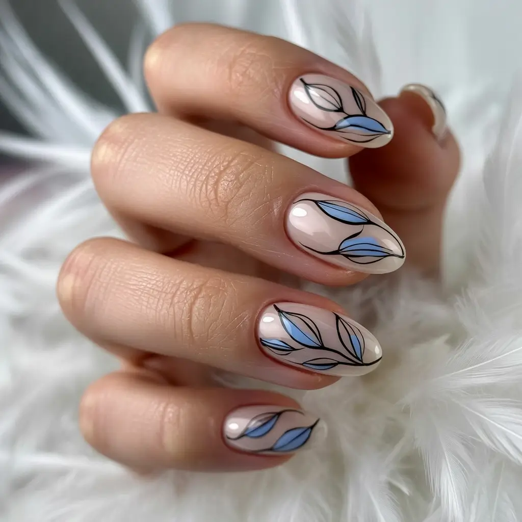 Delicate pastel blue botanical nails capture the serenity and freshness of spring through soft colors and subtle natural motifs. The pastel blue base evokes calmness and elegance, serving as a perfect canvas for tiny hand-painted botanical details such as leaves, small branches, or minimalist flowers. These subtle accents introduce an organic, airy feel to the manicure, making it ideal for Easter and springtime inspiration while maintaining a sophisticated and Pinterest-ready aesthetic.
