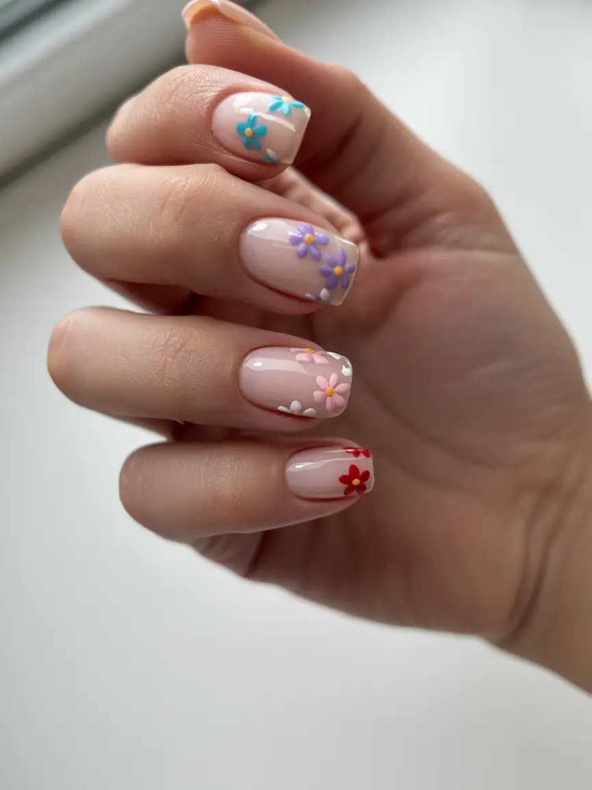 The appeal of this design lies in its simplicity combined with its joyful energy. The short nail length makes it easy to maintain and perfect for everyday wear, while the colorful base and floral details bring a sense of fun and creativity. The daisies can be placed evenly across all nails or focused on a few accent nails for a more minimal approach. This flexibility allows you to customize the design based on your personal style, making it suitable for both subtle and more expressive looks.