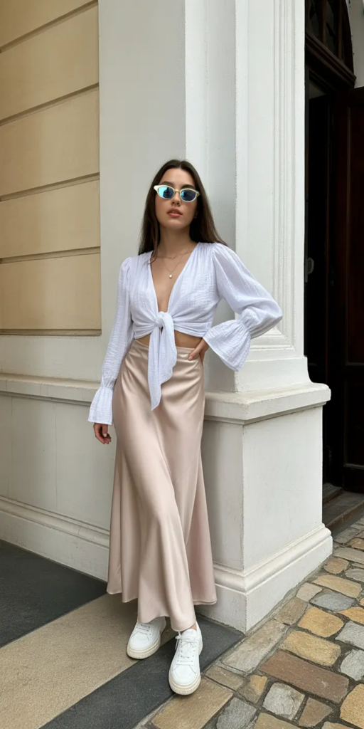 The way silky pieces drape across the body adds a natural sense of confidence and grace. Pairing them with structured yet minimal bottoms, such as tailored trousers or clean denim, creates a balanced silhouette that feels modern and wearable. Layering is key during spring evenings, so a light cardigan or cropped jacket adds warmth without hiding the outfit’s softness. Accessories should stay refined delicate jewelry, a sleek clutch, and simple sandals or low heels work best. The goal is to let the fabric speak for itself while maintaining a calm, romantic energy.