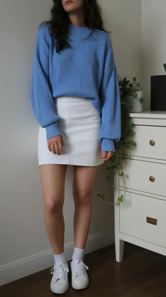 The key to styling this look lies in balancing proportions and textures. A slightly relaxed knit sweater tucked loosely into a structured mini skirt creates a flattering silhouette without feeling overly styled. Choosing a clean-cut skirt in denim, cotton, or linen keeps the outfit modern and fresh. Simple accessories such as white sneakers, ankle boots, or strappy sandals enhance versatility. A crossbody bag and minimal jewelry add subtle detail while allowing the soft blue tone to remain the focal point.